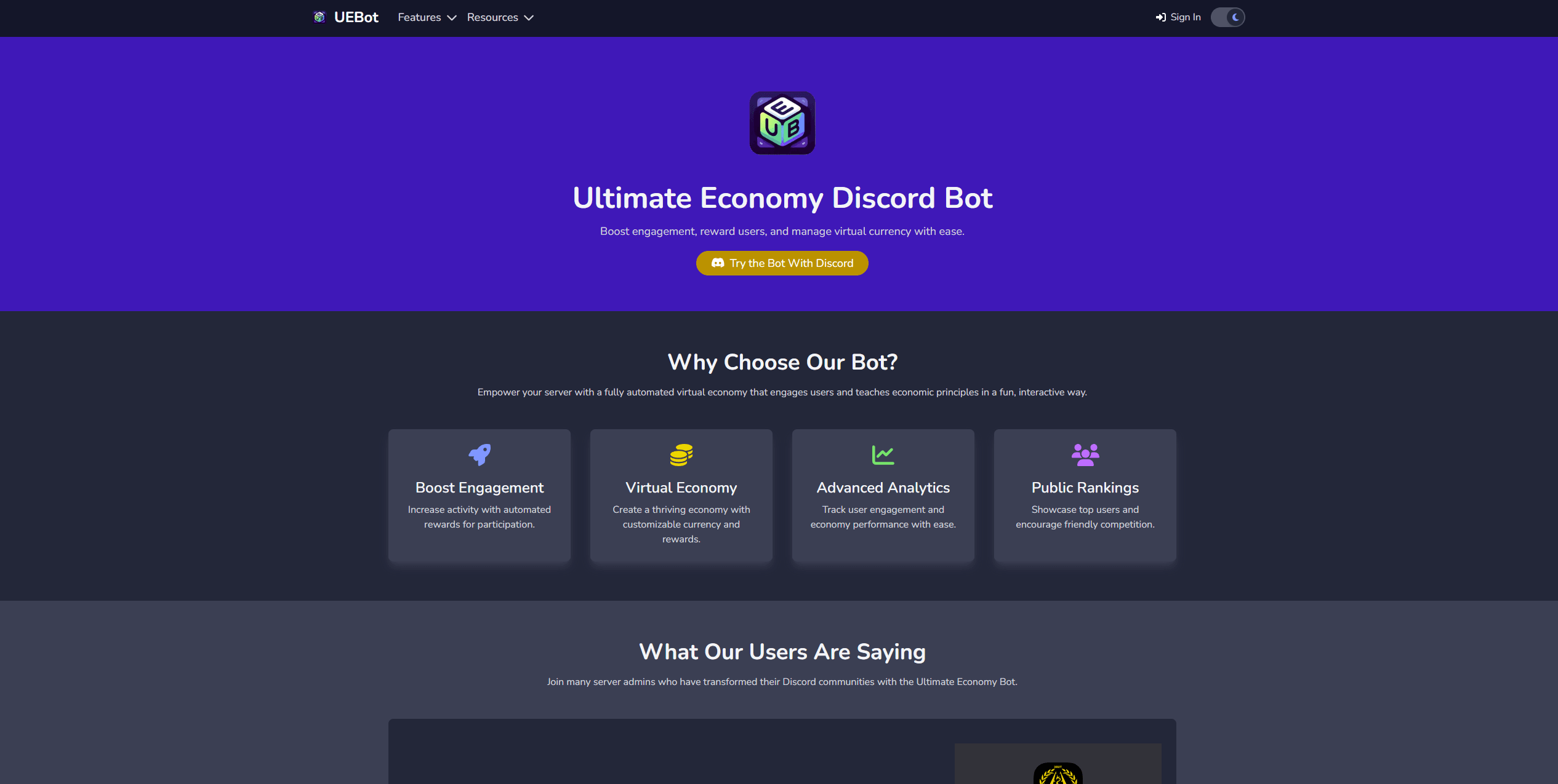 By integrating a virtual economy into Discord servers, UEBot enhances user engagement, fosters community interaction, and provides administrators with the tools to create a dynamic and rewarding experience.